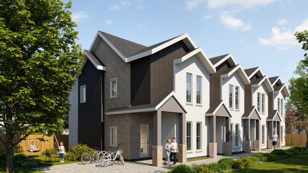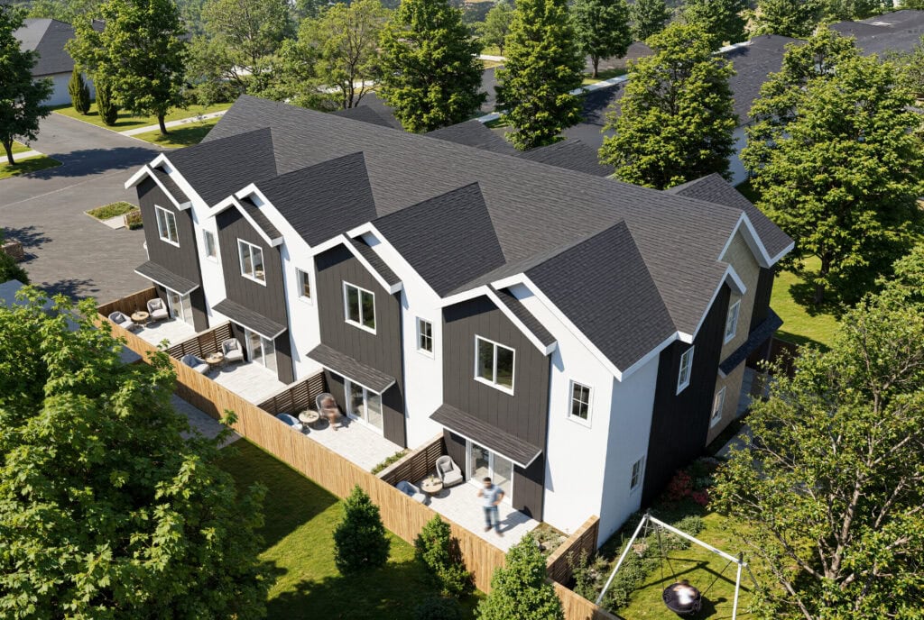 The surrounding context reflects the character of Victoria’s neighbourhood—quiet streets, greenery, and a community-oriented atmosphere—providing a realistic sense of how the townhomes will integrate into the area.